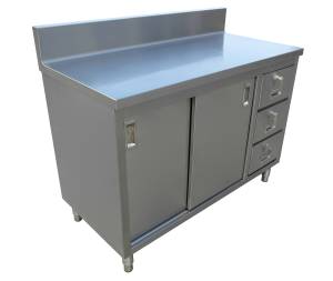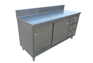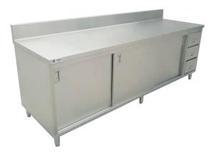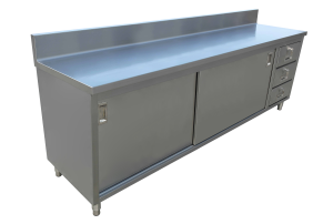 WORKTABLES WITH CABINETS, DRAWERS AND BACKSPLASH