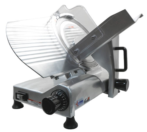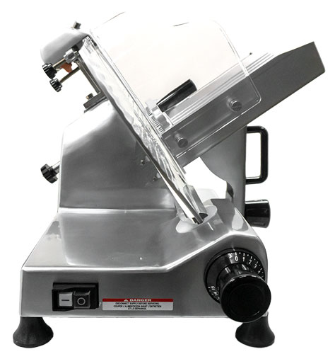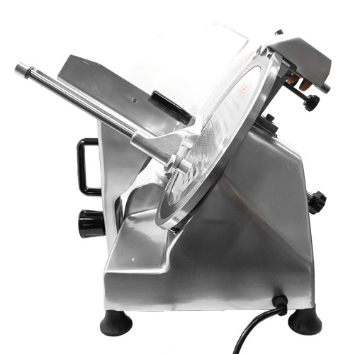 This slicer has an anodized aluminum alloy body. The high carbon steel blades are hard chromed, with a hollow ground taper for extended sharpening and blade life. This economy belt-driven machine offers exceptional cutting consistency and durability. The carriage moves smoothly on ball bearings allowing effortless cutting of deli meats. Easy to disassemble for quick cleaning. Perfect for low-volume operations.