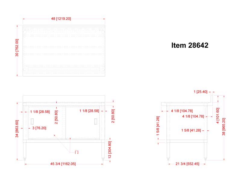 18 Gauge 430 Stainless Steel Enclosed cabinet with sliding doors Stainless Steel Bullet Feet 4″ backsplash NSF approved Shipped on Pallet
