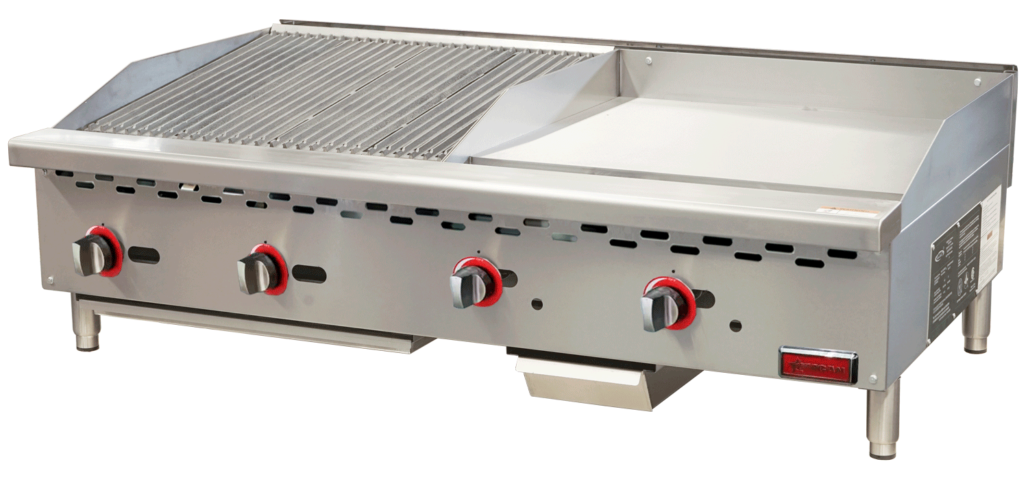 Allows you to grill, sear, and griddle simultaneously. Designed to accommodate natural gas, and features one 12” charbroiler, and one 12” griddle, providing a range of cooking options to suit diverse culinary needs. This countertop unit maximizes space efficiency without compromising functionality, whether searing steaks, grilling vegetables, or preparing breakfast favorites.