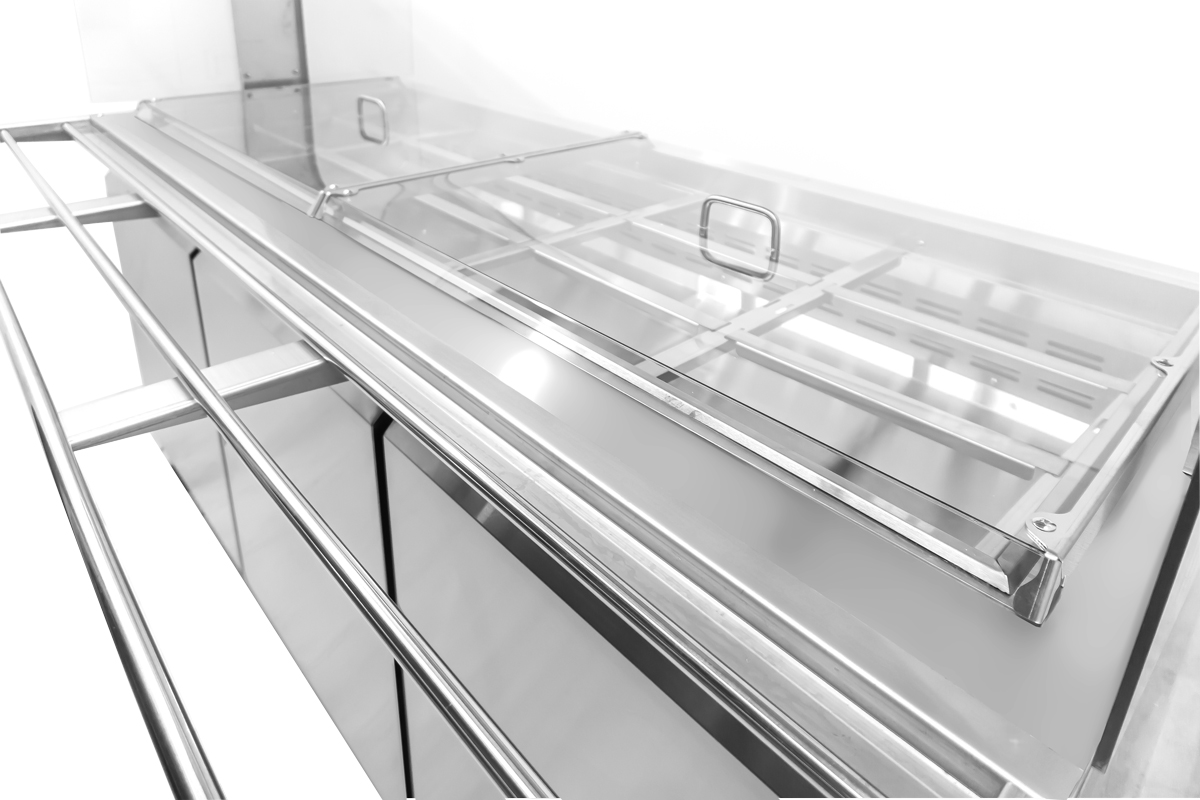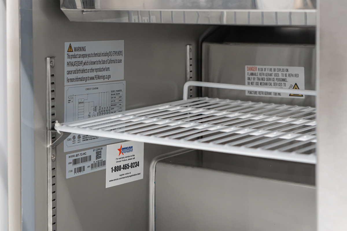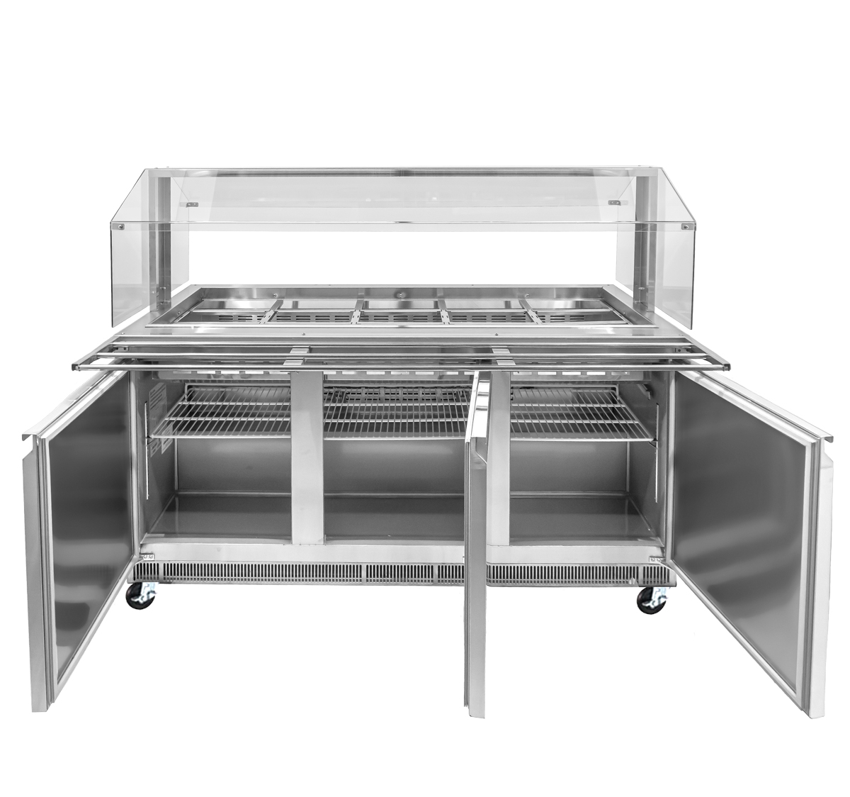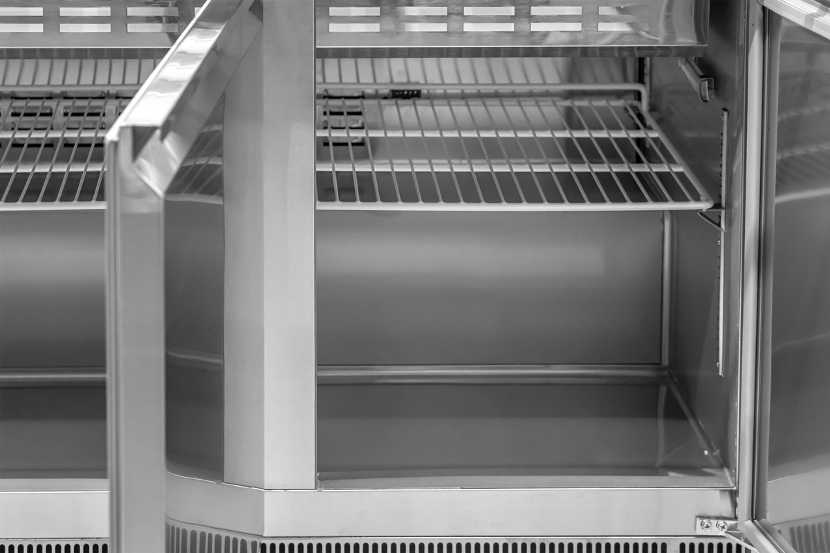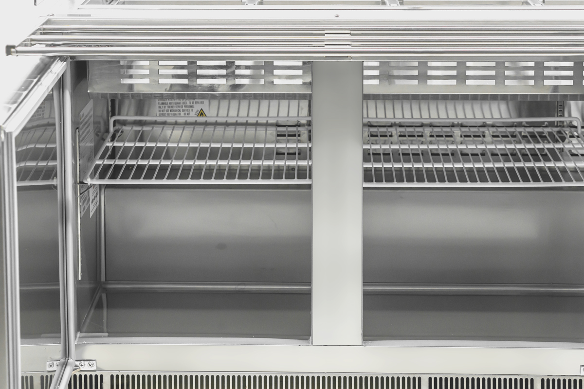 This unit has ample refrigerated storage underneath to keep food refills within reach, with a storage area of 66.6" x 19.8" x 20. Easily access the storage area even during busy service with three conveniently placed doors. The refrigerated storage includes 3 plastic-coated steel shelves of size 21.6" x 17.1 having a loading capacity of 40 kg/90 lbs each.