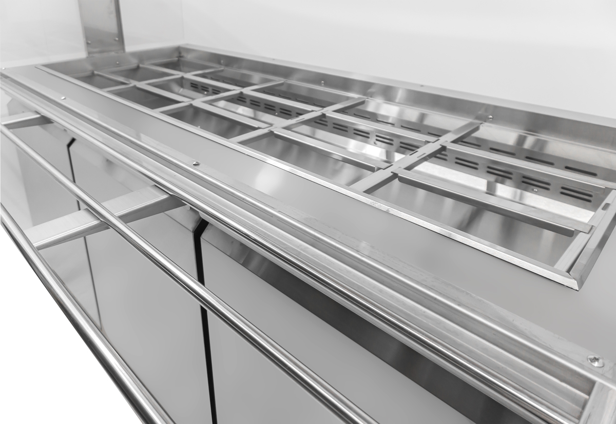 The tray slide can be customized to face either side, depending on how you would like to orient your salad bar table. It can be placed against the wall, or can be used as an island space. Additional tray slide can be made available on request (not included).