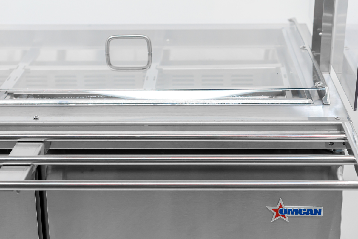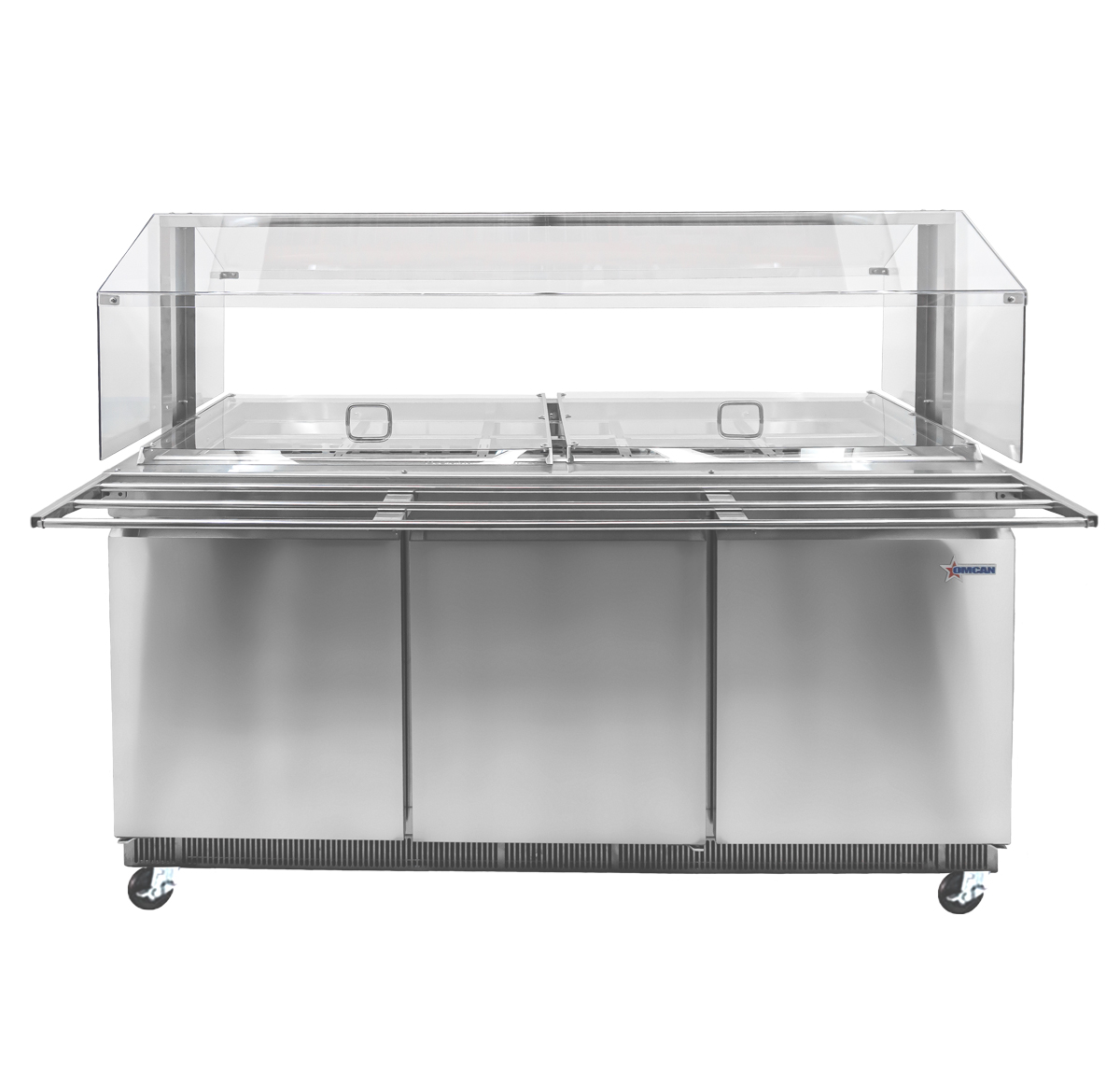 The Omcan refrigerated salad bar is a must have equipment for buffets and self-service areas. This unit comes with a kit comprising sneeze guard, tray slide, 2 pan covers and 15 1/3 GN pans. The unit is extremely spacious and can hold upto 15 1/3 GN pans or 30 1/6 GN pans of 4" depth. There are 5 full size pan slots that can be adjusted to accommodate various combinations of pan sizes.