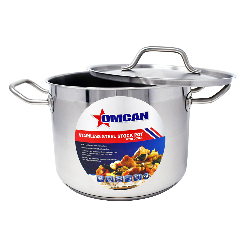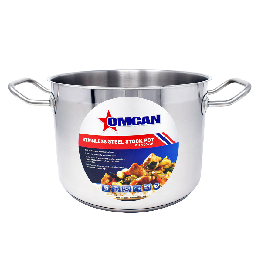 The body of the stainless steel stock pot is made of 20-guage stainless steel and its 3-ply bottom is made by sandwiching an aluminum sheet between two layers of stainless steel.