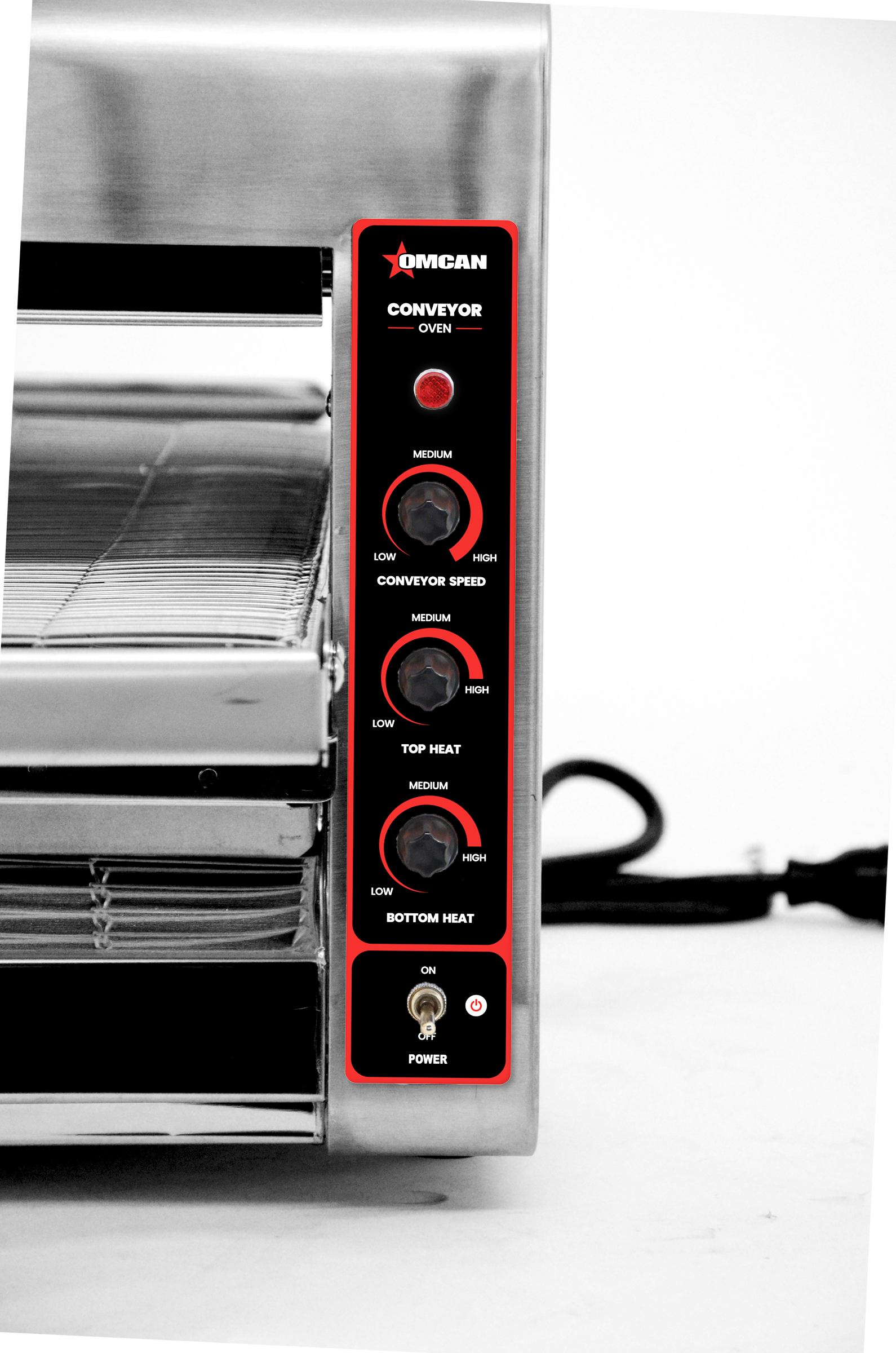 Toasting bread, bagels, and reheating pizza has never been more convenient using Omcan's convection oven with 14-inch conveyor belt. Designed to accommodate your small to medium toasting needs. This conveyor oven will always keep your food at consistent temperatures using built-in infrared heaters with variable speed and temperature controls from 70 - 260 ºC / 158 - 500 ºF. Durably built in a stainless steel body made to handle tough tasks, this conveyor oven is an excellent addition to your kitchen, diner, cafe, and food service!