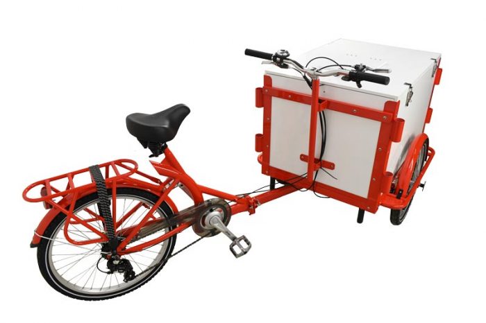 Front Load Ice-Cream Bike / Cargo Bike with Non-Insulated White Wooden Box and Vending Lid – Red