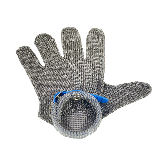 Our five finger stainless steel mesh glove with blue strap has superior cut and protection. Made of stainless steel construction, this ultra-hygienic unit ensures quality safety in the kitchen. Add this glove to your kitchen safety apparel for cutting meats and vegetables.