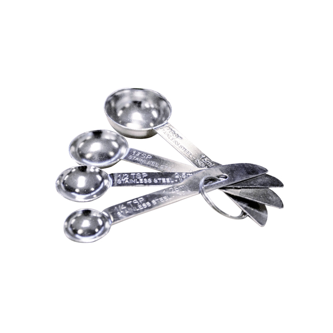 Sizes are: 1/4 teaspoon (1.25 mL), 1/2 teaspoon (2.5 mL), 1 teaspoon (5 mL), 1 tablespoon (15 mL)