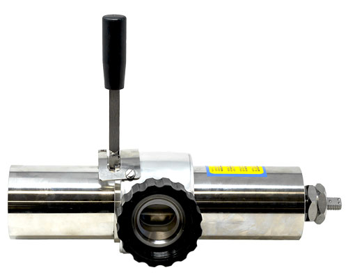 The Portion Head (Item 46180) functions thanks to a cylindrical compartment divided into two smaller compartments with identical volumes. These can be adjusted to give portions of the desired size. The pressure provided by the filler/stuffer to which the Portion Head is attached propels the meat mixture into each of the two compartments alternately. The mixture is then forced out of the portioner through a funnel or through the optional curved nozzle with cutting valve (VD). The time at which each of the two compartments is to be filled is controlled manually with the control lever.
