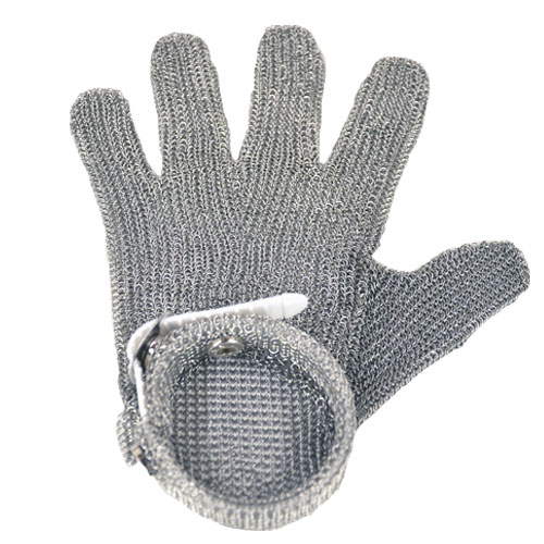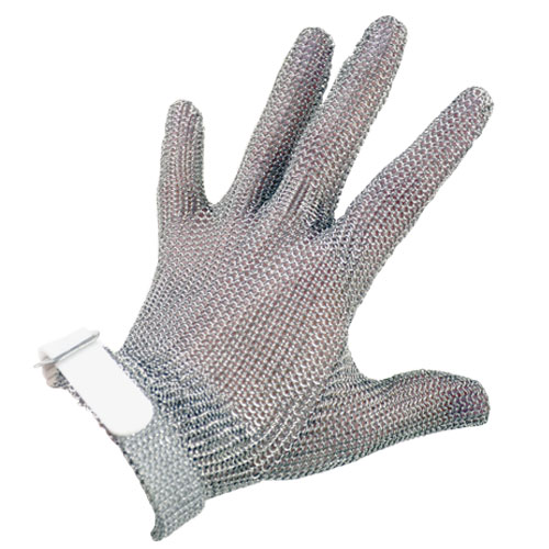 Our five finger small mesh glove with white silicon strap has superior cut and protection. Made of stainless steel construction, this ultra-hygienic unit ensures quality safety in the kitchen. Add this glove to your kitchen safety apparel for chopping vegetables and cutting meats.