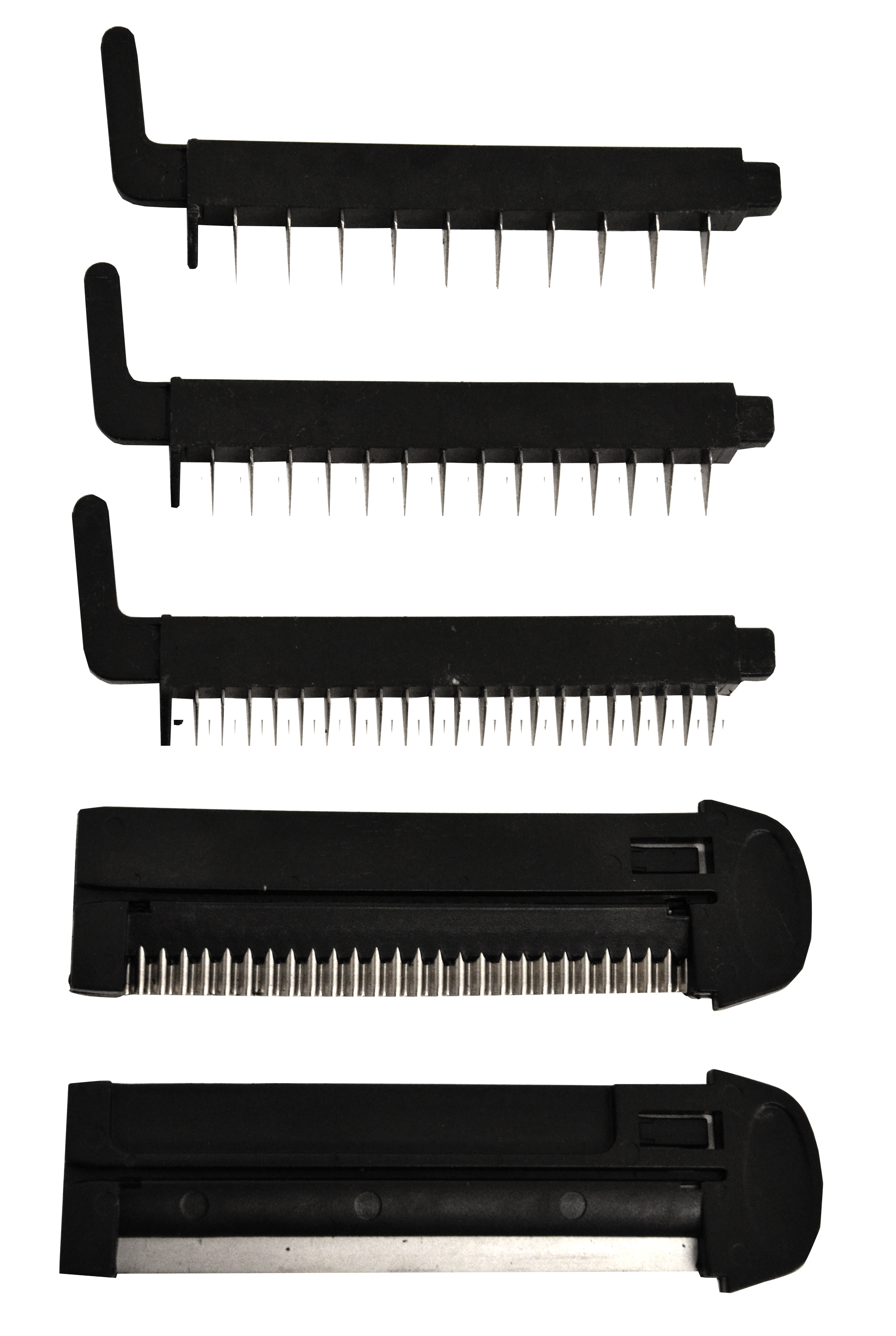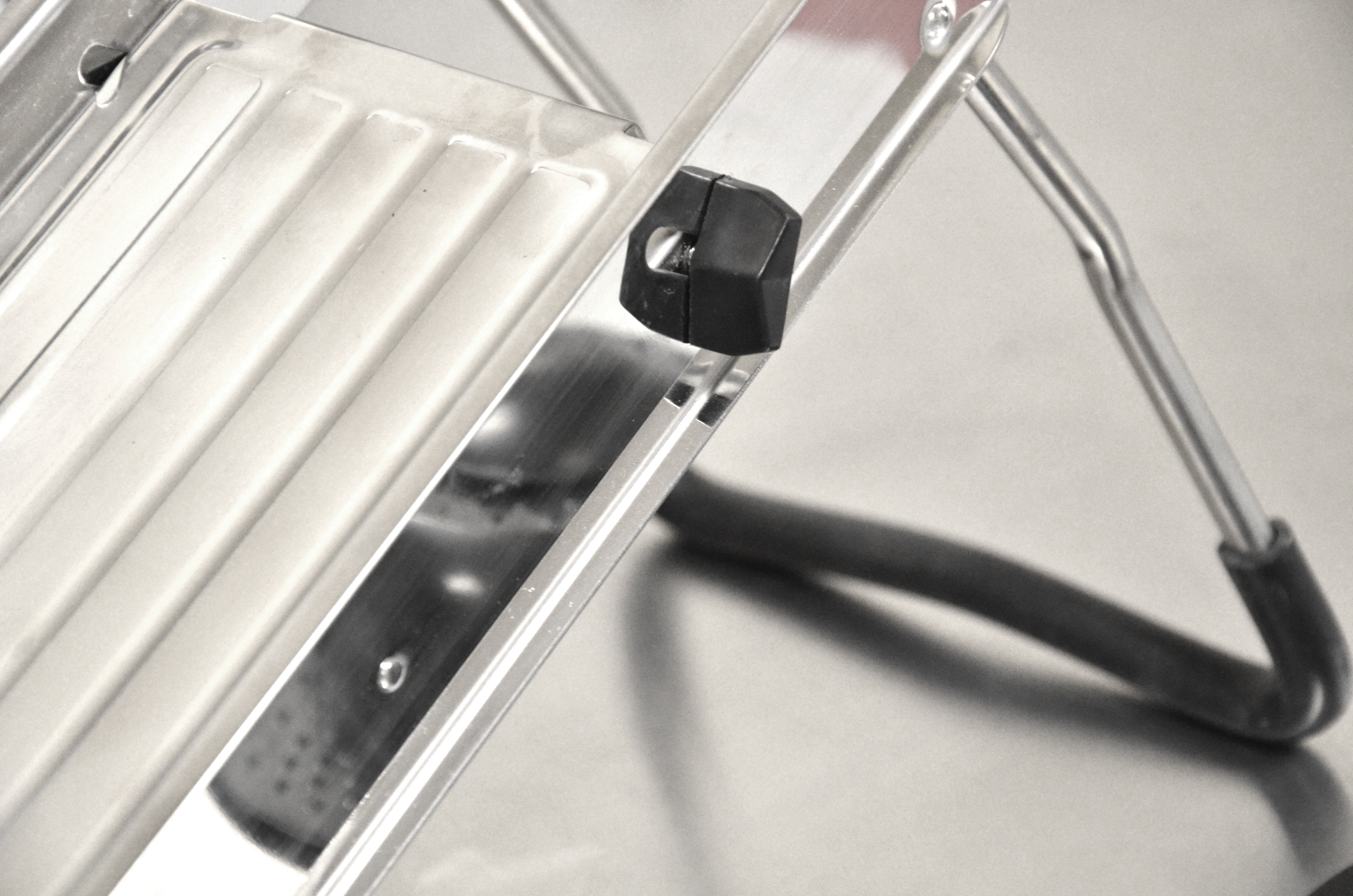 The Omcan Mandoline Vegetable Slicer is made of stainless steel and designed to cut vegetables with ease for small to medium applications. This unit comes complete with five interchangeable cutting blades and a plastic hand pusher. The rubber coated handles and feet provide stability while in use. The top levers allow thickness adjustments of up to 3/8" (9.5mm).