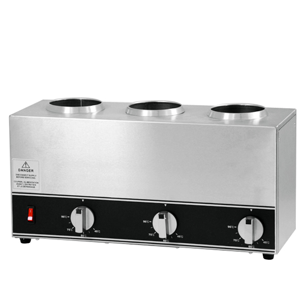 Omcan's Triple Bottle Sauce Warmer keeps your toppings and sauces at optimal temperature for your customers. Comes with three single spout 32-oz bottle.