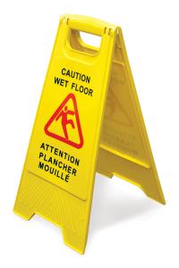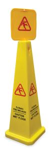 The "A" shaped caution sign is made from molded plastic with a built in handle that makes it easy to move around. The sign displays a clear warning message on both sides. The four sided cone-shaped wet floor sign clearly displays the warning message on all sides. The top of the cone will accommodate a sign that locks in place.